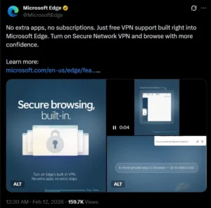 Microsoft recently promoted Edge Secure Network VPN—a free, built-in privacy tool—on X (formerly Twitter). The feature does not require extra apps or subscriptions. This move aimed to raise awareness about Edge’s lesser-known privacy options, especially among privacy researchers.